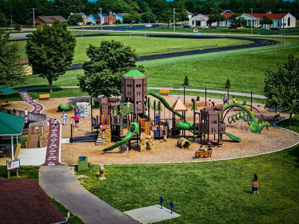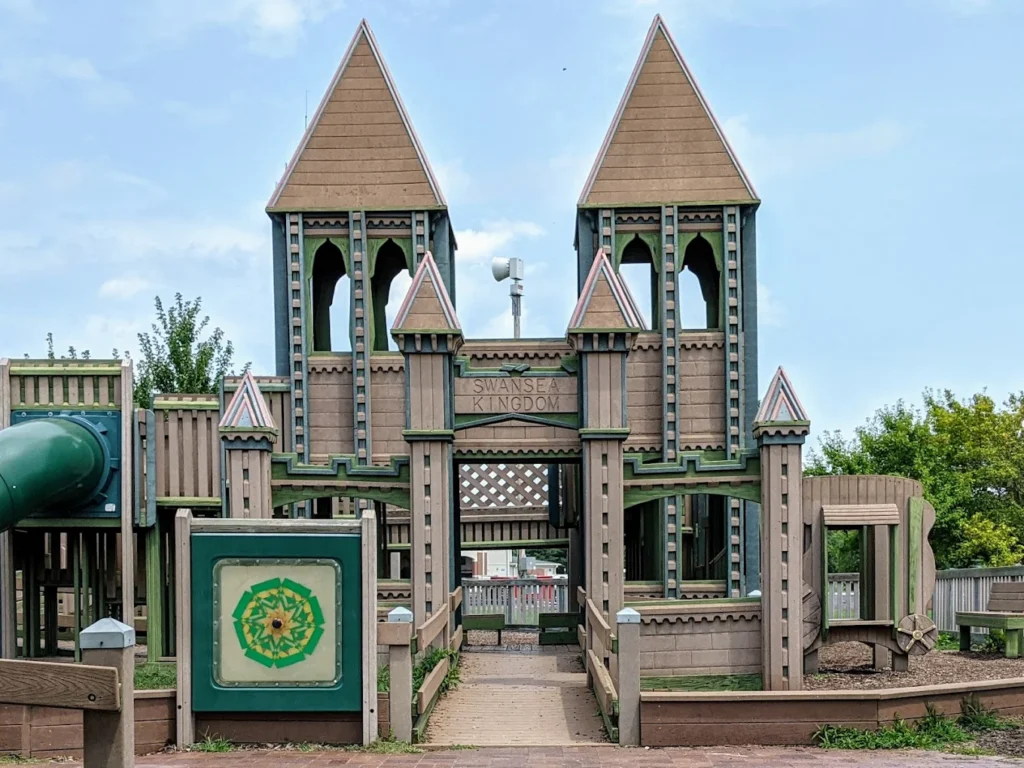 Park with a playground featuring a wooden castle, plus a splash pad, picnic areas, and restrooms.